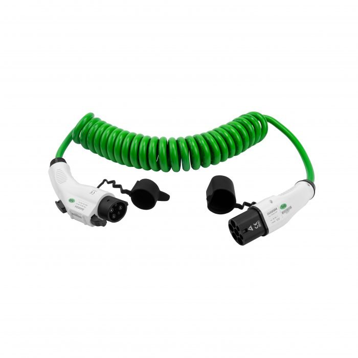 Aukštos kokybės spiralinis elektromobilio įkrovimo kabelis Type 1 į Type 2 – skirtas elektromobiliams ir įkraunamiems hibridams su Type 1 jungtimi, kai naudojamos įkrovimo stotelės su Type 2 lizdu.